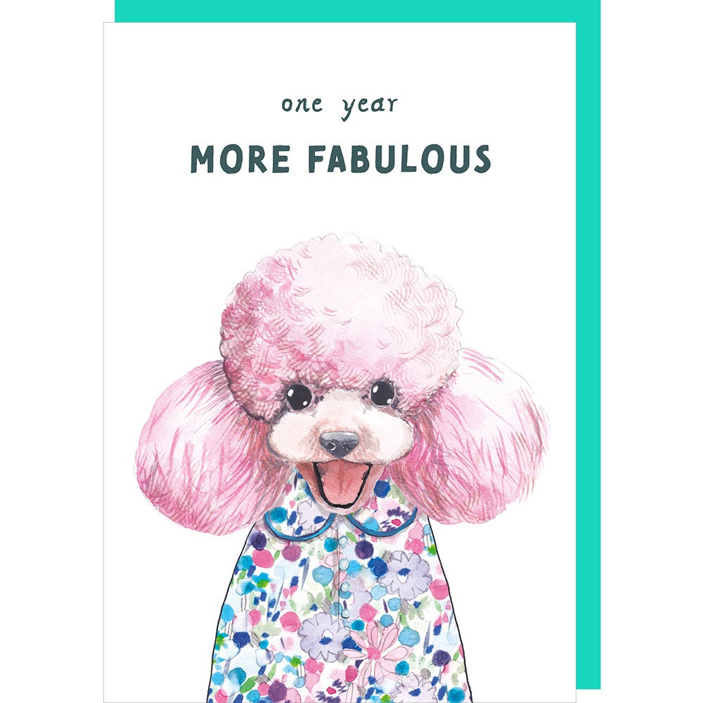 Here’s some new cards added to our Tipp Top range, designed collaboratively with Tipperleyhill, with a magnificent pink poodle illustration, the caption reads, “one year more fabulous”. This card is blank inside for your own birthday message, and comes with a bright aqua coloured envelope. Designed and printed in the UK on luxury FSC approved card.